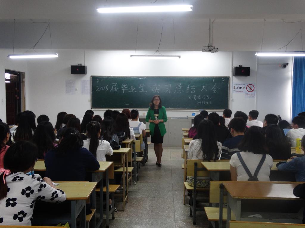 大会由yL23411永利官网登录副院长曾沉老师主持,yL23411永利官网登录院长蒋燕老师、yL23411永利官网登录副院长刘碧芬老师、yL23411永利官网登录教务科科长柴能老师、yL23411永利官网登录团总支书记王旭老师参加了此次实习总结大会。2016届英语专业和日语专业共90多名即将毕业的学生参加了此次大会。