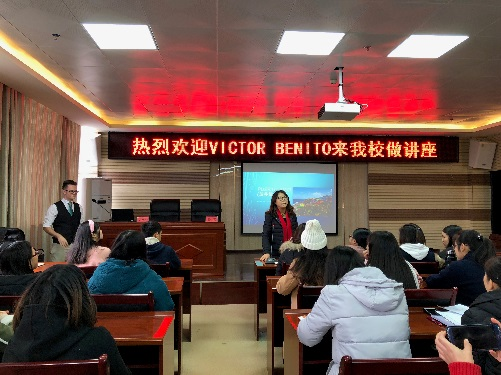 外教VICTOR BENITO介绍了波多黎各的社会发展历史、人文风情、宗教信仰以及自己家族的历史,为师生们提供了一个英语学习的机会。