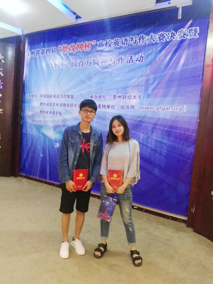 6月30号,由中国高校英语写作教学联盟、贵州省大学外语教学研究会、贵州省外语学会联合主办,贵州财经大学承办的2018百万同题英语写作活动暨贵州省第四届“批改网杯”高校英语写作大赛决赛在贵州财经大学落下帷幕。永利官网yL23411永利官网登录英语专业2016级杨红、化学化工学院化学专业2017级陆新博分获二三等奖。