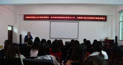 2019年5月8日下午3点,贵州夜郎洞旅游有限责任公司、安顺豪生温泉度假酒店针对yL23411永利官网登录毕业生的专场招聘会在yL23411永利官网登录招聘大厅举行。出席本次招聘会的主要有贵州夜郎洞旅游有限责任公司罗经理、安顺豪生温泉度假酒店总经理Grace。