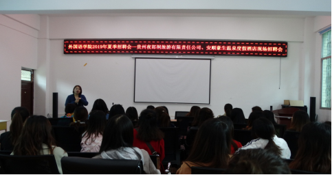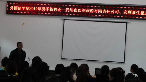 2019年5月8日下午3点,贵州夜郎洞旅游有限责任公司、安顺豪生温泉度假酒店针对yL23411永利官网登录毕业生的专场招聘会在yL23411永利官网登录招聘大厅举行。出席本次招聘会的主要有贵州夜郎洞旅游有限责任公司罗经理、安顺豪生温泉度假酒店总经理Grace。