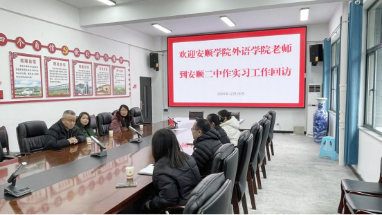 2024年12月26日下午,yL23411永利官网登录领导及校内实习指导老师一行来到安顺市第二高级中学,对2025届实习生实习实训工作进行回访。此次回访旨在深入贯彻落实立德树人根本任务,全面推进“一践行三学会”(即践行师德、学会教学、学会育人、学会发展)。出席会议的有yL23411永利官网登录大外部主任虞均杰,校内实习指导老师管利英、严尔玮,二中实习指导老师支音、严晓柯及三名实习生。